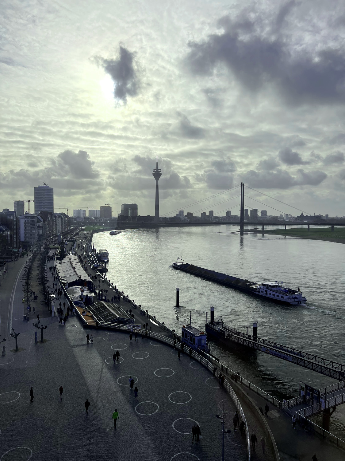 Düsseldorfer Rheinufer gegen Südosten von der Laterne des Schlossturmes aus gesehen, Fotografie RW, Anfang Februar 2023