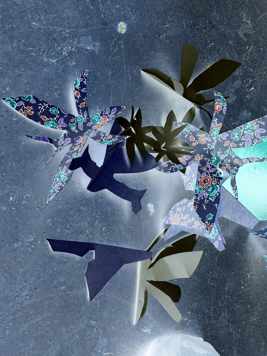 Schnittversuche mit bunten Papieren aus Verona, gekauft in München bei CARTA PURA, invertierte Fotografie RW, 4. Mai 2024
