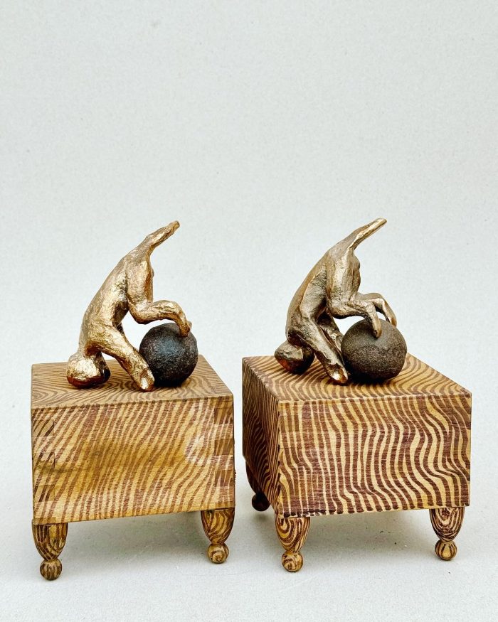 Bronzefiguren mit Moquimarbles (Herkunft Utah, USA) auf bemalten Holzsockeln, Sammlung RW, Fotografie RW, April 2024