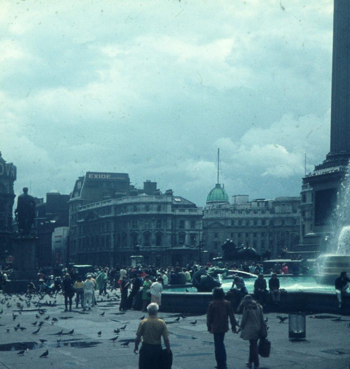 Heute am Vormittag kam ein Schiff mit dem Namen BIG BEN an meinem Rheinfenster vorbei. Als wolle es einen spöttischen Abschiedsgruß zum BREXIT senden. 1970 flog ich zum ersten Mal in meinem Leben – nach London. Mit meiner sehr einfachen Kamera machte ich ein paar Aufnahmen am Trafalgar Square. Auf einem Gebäude hinten ist der Schriftzug EXIDE (batteries) zu sehen. Es ist eine Reklame für die amerikanische Firma Exide Technologies. Links am vom Bildrand angeschnittenen Gebäude sind noch die Buchsatben OVR von BOVRIL, einer Werbung für Fleischextrakt, zu lesen. Man kann im Internet historische Fotos finden, auf denen eine ähnliche Ansicht des Platzes zu sehen ist – Fotos vom Ende der 40er Jahre bis in die 70er Jahre. Hätte ich direkt in die Straßenschlucht von Whitehall zwischen BOVRIL und EXIDE fotografiert, wäre der Blick auf BIG BEN möglich gewesen.
