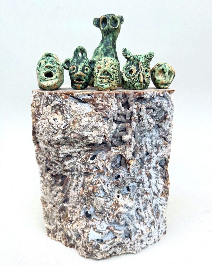 Einen Stein habe ich mir gesichert aus dem alten Haus Dorgarten. Es ist ein Kalksinter, vielleicht ein Travertin aus Tivoli, den ich von Bauwerken in Rom kenne, seine Herkunft werde ich noch genauer erforschen. Ein Calciumcarbonat, das aus Süßwasserquellen als Quellkalk ausgefällt wird. Ein recht junges Sediment-Gestein aus dem Quartär, also höchstens 2,6 Millionen Jahre alt. Oft bilden sich bei der Ausfällung Pflanzenstrukturen ab. So haben wir als Kinder die Steine auf der unteren Terrasse in Haus Dorgarten nicht nur betrachtet, sondern auch mit unseren Händen befühlt und gespürt, dass manche kühl, andere eher warm waren. Den Travertin nannten wir versteinertes Stroh und hatten damit gar nicht so unrecht. Viele Halme sind an der Oberfläche meines Steines zu sehen. Der Stein war, als wir im Winter 1958 mit der fast achtköpfigen Familie (das sechste Geschwisterchen war unterwegs) in das große Haus zogen, hell, frisch und graugelblich. In den Wänden der Terrasse verbaut mit anderen wunderbaren Steinen, allesamt als quergelagerte längliche Quader in schöner Abwechslung. Ich erinnere mich an rote und grüne Sandsteine, fossilienreiche graue Kalke, sehr weiße Kreidesteine, aber auch an dunkelgrauen Balsalt. Als wir in diesem Frühling uns alle sechs trafen, kamen wir auch an dem lange verlassenen, großen Haus vorbei und sahen, dass dort jemand auf der oberen Terrasse herumging. Es war der Abrissunternehmer, der uns zum letzten Mal ins Haus ließ – und wir baten ihn, uns einige Steine zu retten. Erzählten ihm, dass ein Steinmetz das Haus hatte bauen lassen – eine Schwester behauptete, das sei in den 20er, 30er Jahren gewesen. Wir wissen es nicht, das Internet gibt nichts preis. Hatte unser Vater nicht erzählt, dass die ehemaligen Bewohner des Hauses in den 60er Jahren einmal am Gartenzaun standen und sehen wollten, wer denn die neuen Bewohner seien? Nun, als wir zwei lange Quader Travertin vor dem Zermahlen gerettet hatten, brachten wir sie zu einem Steinmetz und ließen sie in sechs Schnittlinge sägen. Die Oberfläche der Steine war voller Hochofenruss und Industriestaub schmutzig und dunkel geworden. Wie oft war der Himmel im Westen hinter dem Haus zum Hütten-Abstich rot aufgeflammt und der Russ lag im Herbst auf den reifen Früchten der Pflaumen- und Apfelbäume des großen Gartens… Der Steinmetz hat den Stein nicht nur geschnitten, sondern auch gereinigt, so dass nun die hellen Farben wieder zum Vorschein kommen. Ich setze heute sechs meiner neuen grünglasierten Keramiken auf den alten Stein und lasse sie im Chor etwas singen.