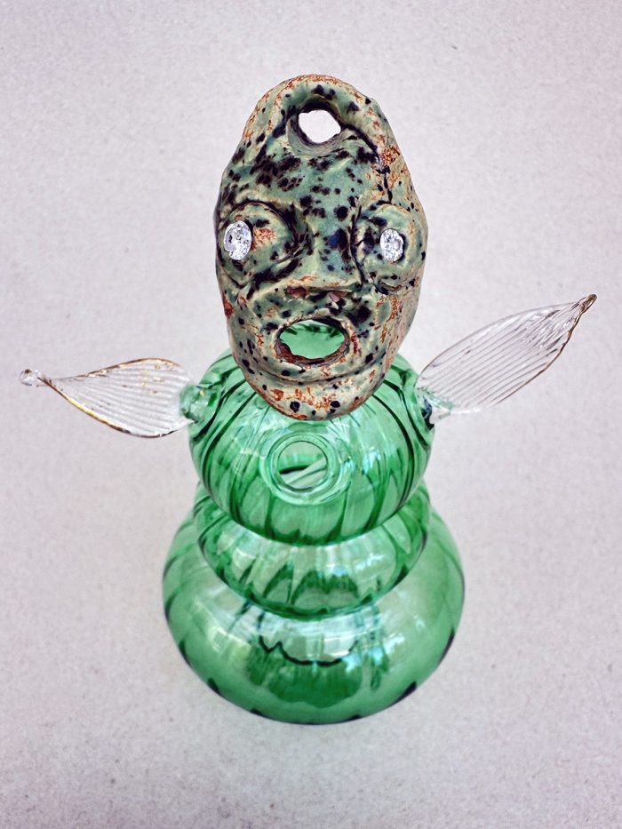 Neue Kombination aus grünglasierter Keramik mit Brillantaugen auf grünem Glas, Sammlung RW, Fotografie RW am Sommersonnenwendetag 21. Juni 2025