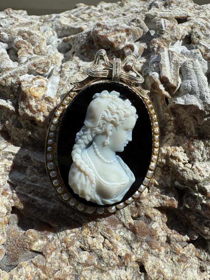 Der Lagenachat wurde gefärbt, so dass die untere Schicht tiefschwarz erscheint und die weiße Schicht etwas grünlich gräulich, nicht kaltweiß. Die Kamée ist schwer, auch das Gold wiegt schwer. Ein kostbares Stück, meint der indische Prinz, aber teuer war es nicht. Oben an der Haube des Mädchens scheint ein kleines Stück der Schleife abgebrochen zu sein, das fällt aber kaum auf. Am unteren Rand des Rahmens ist noch eine alte Abhängung vorhanden, wahrscheinlich hing dort eine größere Perle. Der indische Prinz hat die Kamée im Hunsrück bei einem Antiquitätenhändler gekauft. Dieser konnte aber nichts zu ihrer Herkunft und Entstehung sagen. Wahrscheinlich wurde sie in der zweiten Hälfte des 19. Jahrhunderts in Idar Oberstein geschnitten, dann nach Frankreich importiert, um in Rouen oder Paris gerahmt zu werden. Der indische Prinz dachte an den berühmten Goldschmied Alexandre-Gabriel Lemonnier, der an der Place Vendome sein Geschäft hatte und Hoflieferant Napoleons III. war. Er gab zu – ein bisschen sehr hochgegriffen – aber französisch kam ihm das Schmuckstück schon vor, er hatte ein Vergleichstück bei einer Pariser Schmuckhändlerin gesehen, natürlich viermal so teuer.
