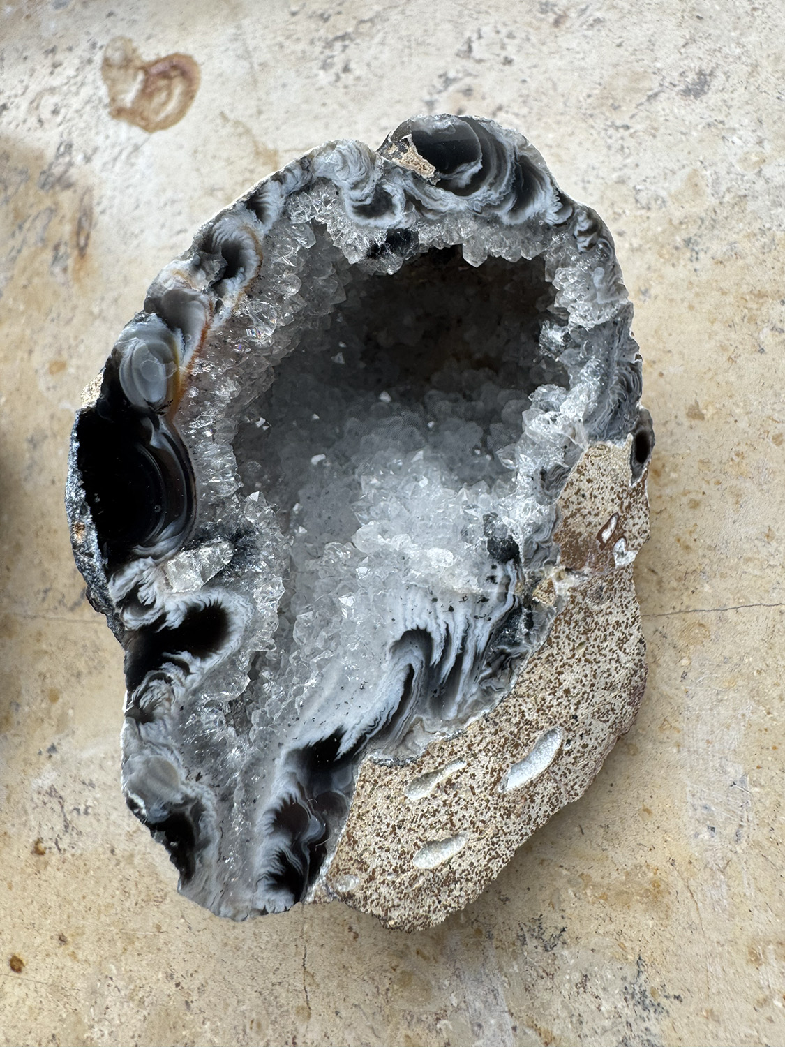 Gemme in Lagenachat mit Goldrand und Perlen auf Travertin, Sammlung RW, Fotografie RW, 1. Juni 2025