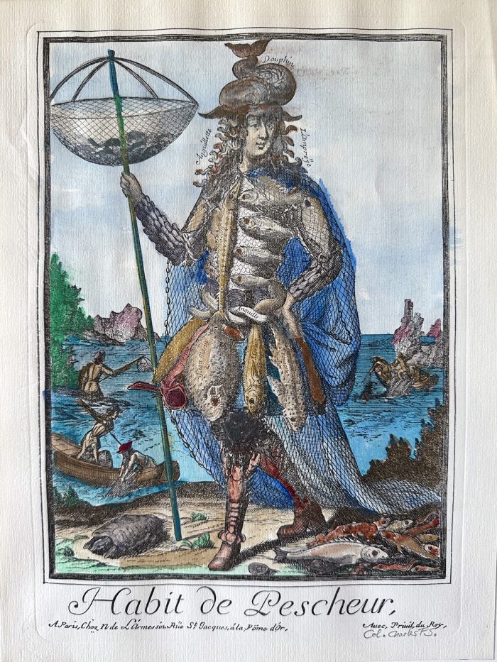 Das vorliegende Blatt gefällt dem indischen Prinzen sehr, alle Meerestiere sind mit Namen beschriftet, meist kennt er diese aus der französischen Küche: die Haare des eleganten Fischers bestehen aus kleinen, sich kringelnden Aalen und Neunaugen, ein Delphin muss als Hut herhalten. Barsch, Meeräsche und Schleie bilden seine Weste, ein langer Stör zeigt eine Knopfleiste an. Am Aal-Gürtel hat er Dorsch, Hecht und Seelöwe hängen – wobei der Seelöwe wie ein Fisch aussieht – vielleicht ist der Loup de mer gemeint. Auf Kniehöhe trägt der Pescheur einen Taschenkrebs. Die gesamte Figur, im raffinierten Kontrapost am Meeresstrand stehend, erinnert an die höfische, französische Mode zur Zeit Ludwigs XIV. Zumal das französische Wort für Delfin Dauphin ja auch einen Prinzen meint – Louis de Bourbon (1661–1711), Dauphin von Frankreich und Sohn Ludwigs XIV hat Larmessin 1680 in einer Gravur verewigt. Fast sieht es so aus, als wäre dieser Fischer ein Porträt des Dauphin, die vielen Locken, das Gesicht – eine verblüffende Ähnlichkeit.
