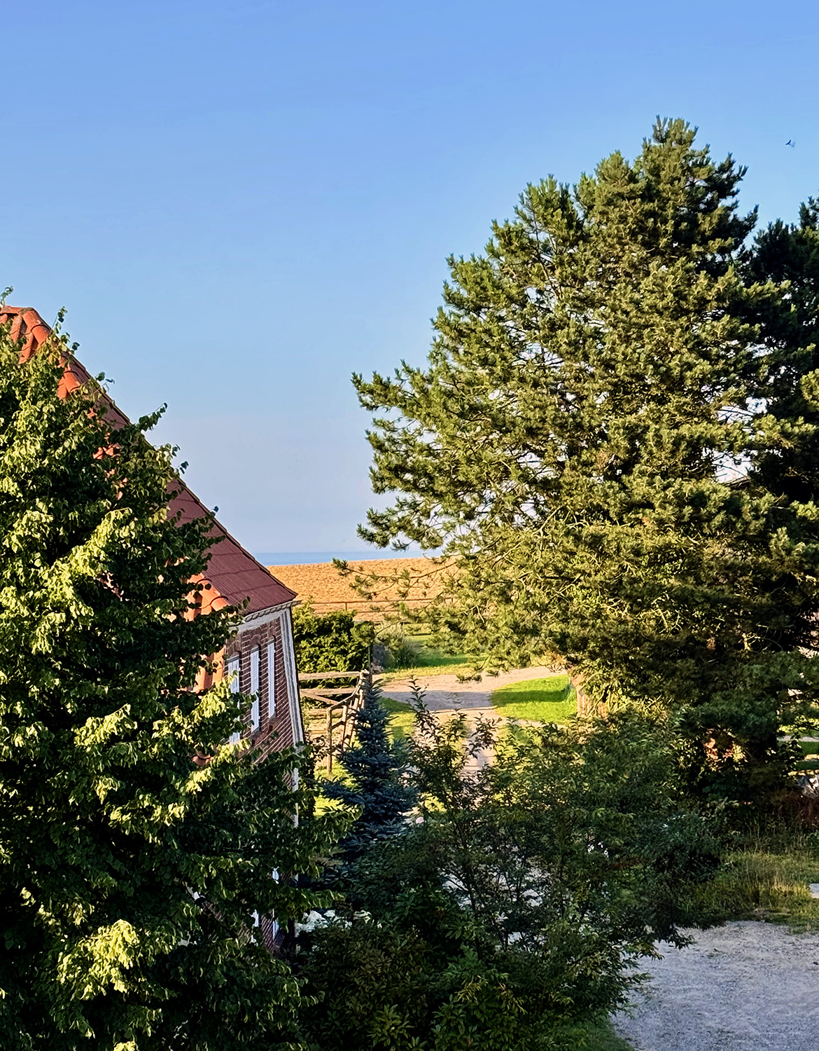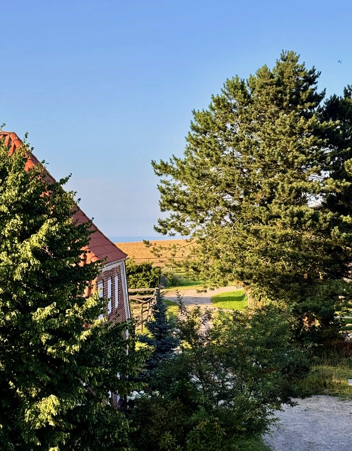 Ich bin so glücklich – während ich schreibe, kann ich über den oberen Rand des Bildschirms schauen. Ich sitze direkt am Fenster. Hinter dem Stoppelfeld kann ich die Ostsee sehen. Es ist sehr ruhig, nur die Spatzen schimpfen die ganze Zeit, nicht aufdringlich, aber gut hörbar. Die Schwalben fliegen höher und höher – der Luftdruck hat sich verändert. Sie scheinen eine wahre Freude zu haben beim Mückenfang und nicht nur das, sie fliegen Kunststückchen, treffen sich im Flug, drehen ein paar gemeinsame Kurven. Der Himmel ist strahlend blau mit ein paar zerstäubenden Federwölkchen. Das Meer setzt sich noch tiefer blau gegen den Himmel ab. Je später es wird, um so schärfer zeichnet es eine immer präzisere Grenze am Horizont.