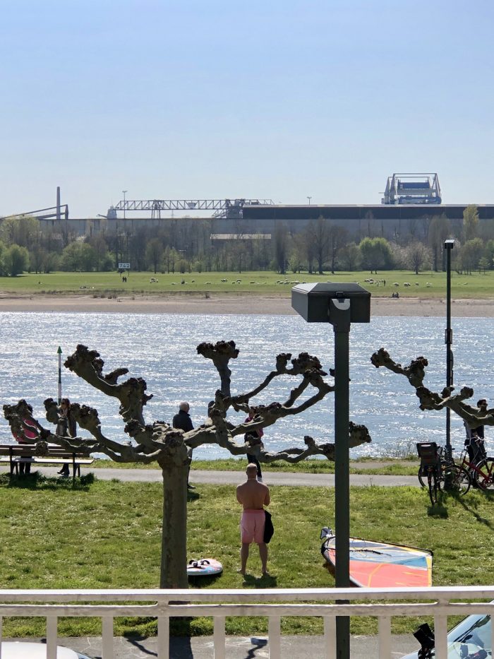 Wie verrückt geworden kommen die Leute in Wind und Sonne an den Rhein, fahren Rad, Skateboard, joggen, packen ihre Surfbretter aus und rasen in die Flutwellen der großen Containerschiffe. Jagen bis zur Erschöpfung von einem Ufer zum anderen. Dort umkreisen die Spaziergänger, immer nur zu zweit, die Schafe mit ihren frisch geborenen Lämmchen.