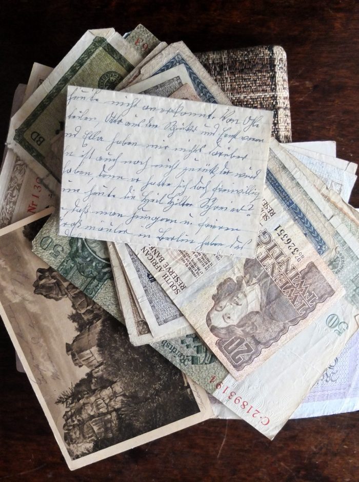 Ein Poesiealbum aus den 1930er Jahren, Geldscheine aus den 1920er und -30er Jahren, eine Postkarte von 1929 mit den Externsteinen, Teutoburger Wald, 20 Rand aus Südafrika, ein zusammengefalteter Brief vom 19. November 1945. Angehäufte Zeugen leidvoller Geschichte.